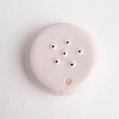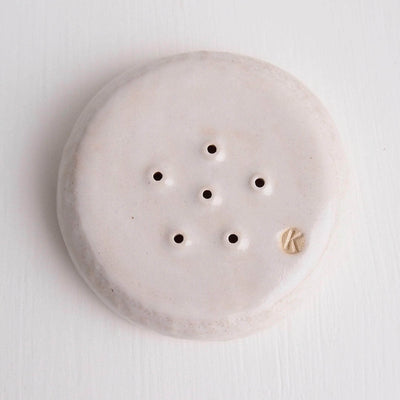Handmade textural white stoneware ceramic soap dish with six drainage holes.