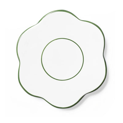 The saucer is in white glazed ceramic with an aqua green flower stripe.