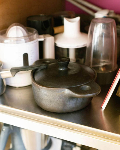 The Small Karipot is part of Tiipoi's ceramic cookware range. This ceramic pot is completely hand-built from a combination of river clay and ground stone sourced from Longpi, in the North East of India.The hand-burnishing process used during the making of KARIPOT gives it a naturally non-stick surface making it ideal for slow cooking or one-pot everyday meals. Oils and ingredients are preserved while cooking as the pot recirculates moisture and preserves flavour. Tiipoi's clay cooking pot can be used on both gas and electric hob and in the oven.