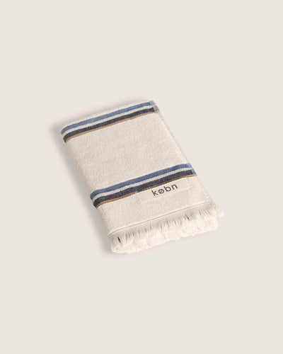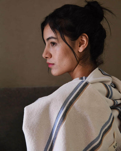 Inspired by the vibrant colours and traditions of Marrakesh, Ecru features stripes in contrasting Azure, Deep Navy and Tan with details in raw fringing.