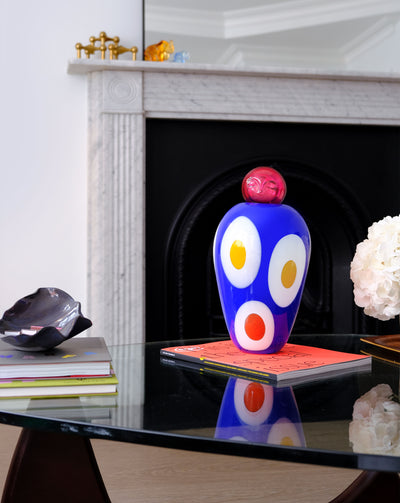 Part of the Evil Eye Series, it is inspired by the Turkish "Evil Eye," traditionally believed to ward off negative energy. Each piece features abstract eye motifs in various colorways, delicately formed in hand-shaped glass. The series also draws from the spirit of Japanese Kokeshi dolls—symbols of good fortune and well-being—blending two meaningful cultural icons into a subtle expression of protection and prosperity.