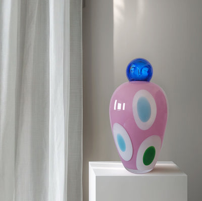 A one-of-a-kind, two-piece product, carefully mouth-blown and featuring hand-placed organic shapes designed to add a vibrant and expressive character to any space.
