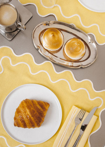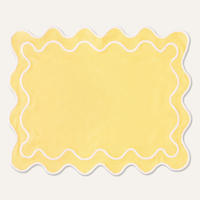 This pair of yellow placemats in a linen mix, with a playful wavy cut and contrasting white wavy embroidery, adds a touch of refinement to the dining table.