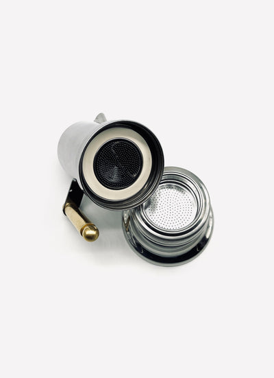 Vintage Vev Vigano coffee pot, milk jug and sugar bowl, made in stainless steel. This vintage coffee set by VEV from Italy, model Depositato, from the 1980s, is an elegant and decorative piece for everyday use. The mocha pot, milk jug and sugar bowl are decorated with golden details and ornate golden handles and balls on the lids, giving them a special sophistication.