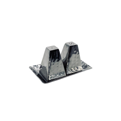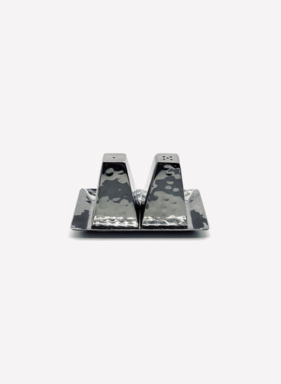 This vintage modernist salt and pepper set in hammered metal, features two triangular shakers perched on a rectangular base. Its sculptural design combines utility with architectural elegance, making it a refined tabletop statement.