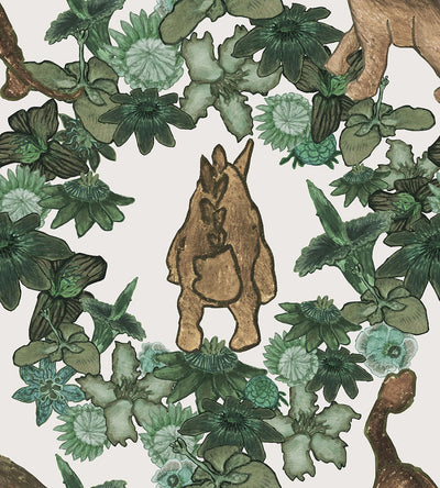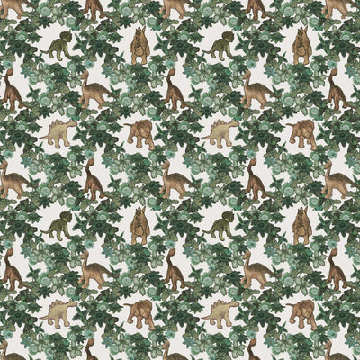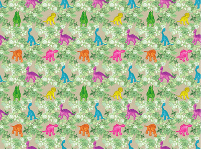 Dinosaurs roam through a lattice of exotic flowers, inspired by the childlike magic of coloring books and wax crayons. A playful collision where the plastic world meets the Jurassic age.
