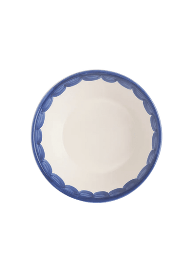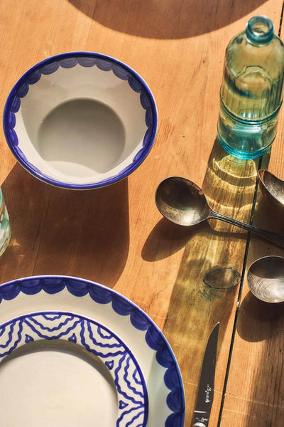 Hand-painted blue scallop bowls. With designs inspired by the 'fajalauza' ceramic tradition of southern Spain, Late Afternoon's dinnerware sets speak of sunshine, long lunches and 'sobremesa': the Spanish word for the conversation over the table after a meal with family and friends. Made in Portugal by artisans, in the long tradition of Iberian ceramics.