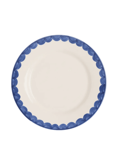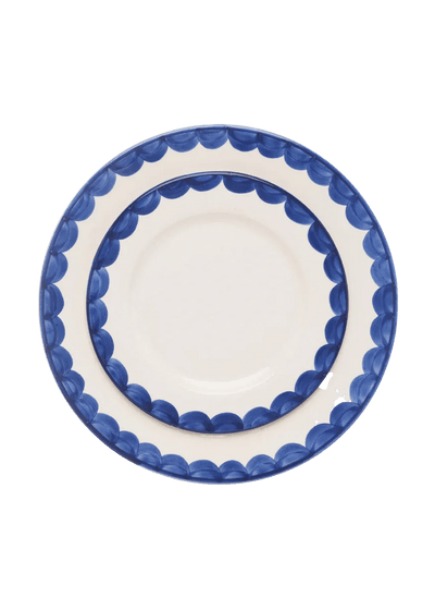 Hand-painted blue scallop dinner plates. With designs inspired by the 'fajalauza' ceramic tradition of southern Spain, Late Afternoon's dinnerware sets speak of sunshine, long lunches and 'sobremesa': the Spanish word for the conversation over the table after a meal with family and friends. Made in Portugal by artisans, in the long tradition of Iberian ceramics. 28cm dinner plate with a well, hand-painted using toxin-free glazes. Full matching set of side plates and bowls available.