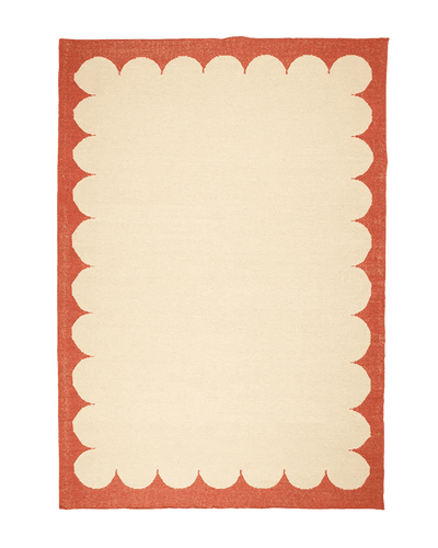 Handmade flat-weave wool rug with rust terracotta scallop border.