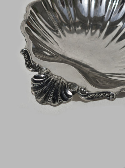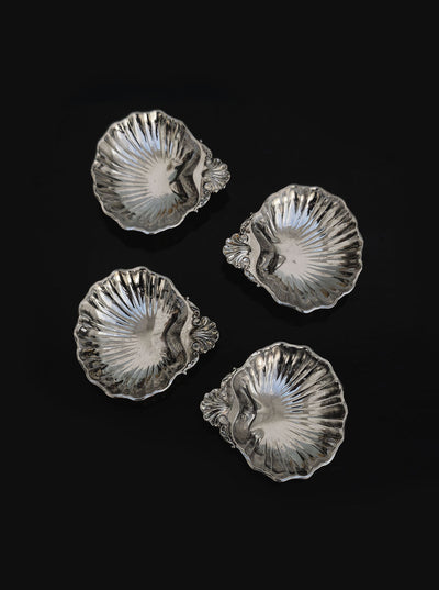A refined quartet of small shell-shaped dishes in polished silver-tone metal, each adorned with intricate detailing. Perfect for serving condiments or displaying small objects, they bring timeless coastal elegance to any table.