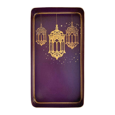 Add a touch of elegance to your decor with these hand-painted iron tray, featuring intricate Arabic-style lanterns in gold on a rich purple background. Designed for decorative use only, this tray brings warmth and charm to any coffee table, console, or wall display.