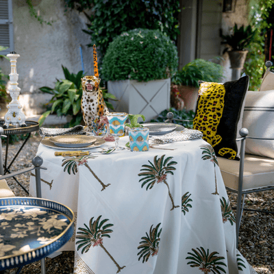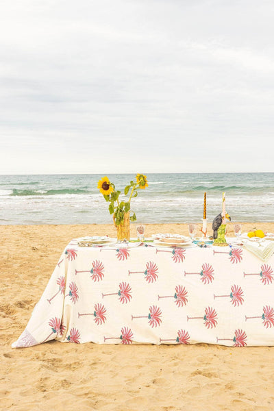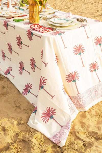 Add a touch of tropical elegance to your dining experience with our hand-printed cotton tablecloth, featuring a palm tree design. Available in refreshing green & white or playful pink & white, this tablecloth brings a breezy, sophisticated vibe to any setting. Perfect for both indoor and outdoor gatherings, it’s a stylish way to infuse your table with natural beauty and vibrant color.