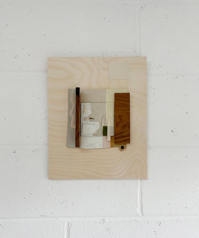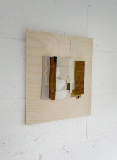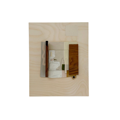 Material: Mixed Media on Plywood panel- Fabric, wood, acrylic and oil pastel. Some of the wood shapes protrude forward creating a 3 dimensionality. Unframed