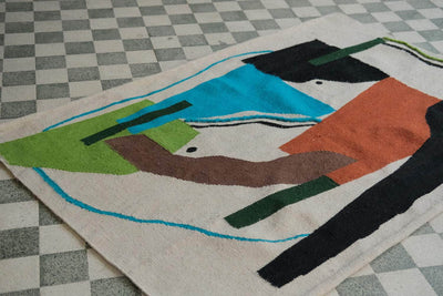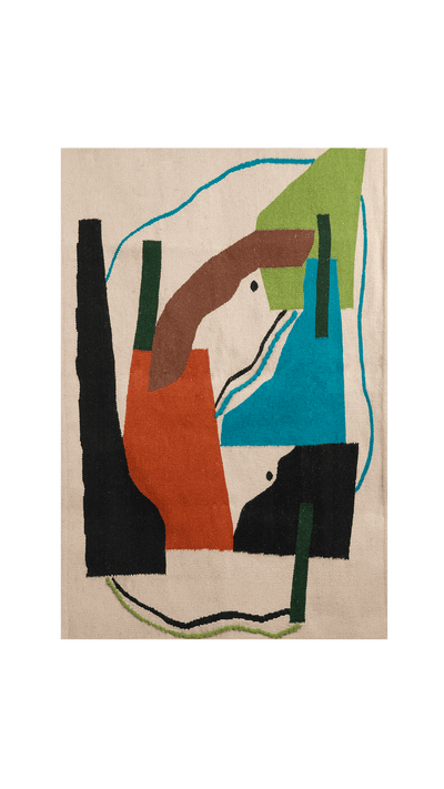 Designer wool rug inspired by artist’s paper collage art. This is a limited edition handmade rug or wall tapestry, up to 3 per design. Wool rug woven on peddle-looms by local artisans in Egypt.