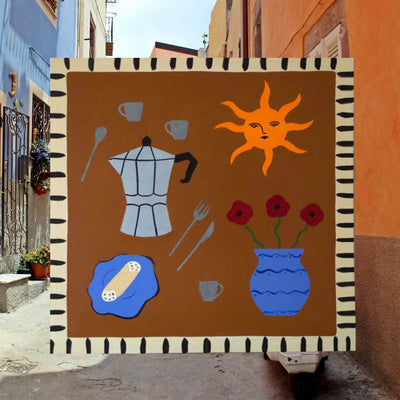 Featuring the most perfect ready to drink morning Espresso pot with it's accompanying breakfast accessories, this is a 24 x 24" original acrylic painting on canvas.
