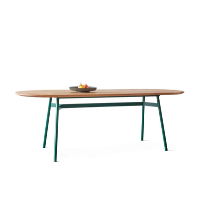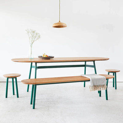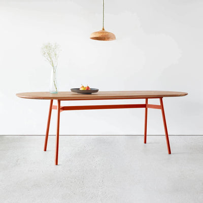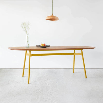 The tabletop rests on a steel base, with powder-coating available in a variety of colours. Custom colours are available on request, to perfectly suit your palette.