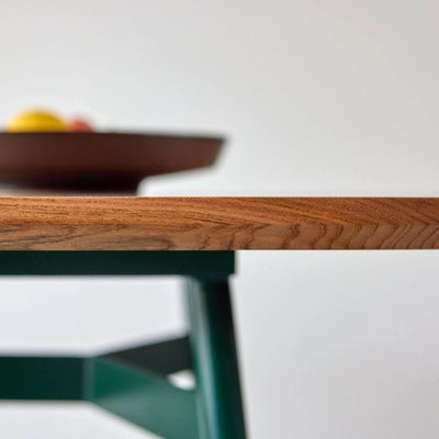 The tabletop is made from solid British wood, in your choice of elm (pictured), oak or walnut, sourced locally from trees that have been felled due to urban development or weather damage.