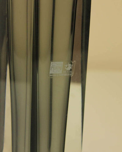 Incredible collector's item with its original label. Vibrant layers of gunmetal-toned sommerso, encased in clear glass. The faceted geometric shape is elegant and modernist. Solid and robust weight.