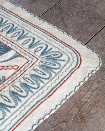 Unusual and unique, the Namda rug is handmade from felting wool to create the soft base, and finished with beautiful Kashmiri chain stitch hand embroidery. Made from unspun wool and cotton, felted and pressed with a traditional woven willow tool, the Namda is an indigenous handcrafted felt rug.
