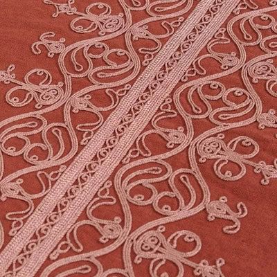Hand embroidered using a Mamluk cording technique, this ornate linen tablecloth is adorned with elaborate cording, designed to add flair to any table.