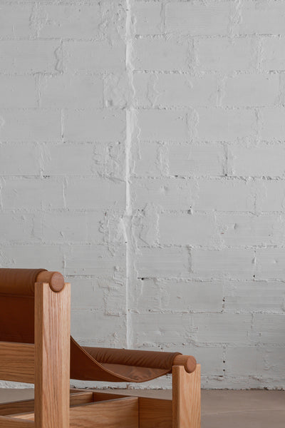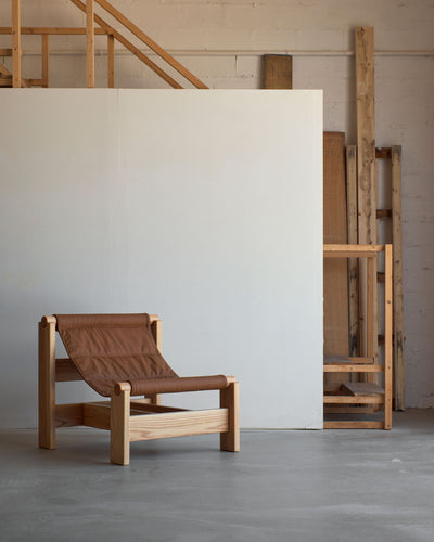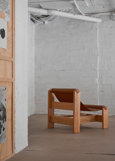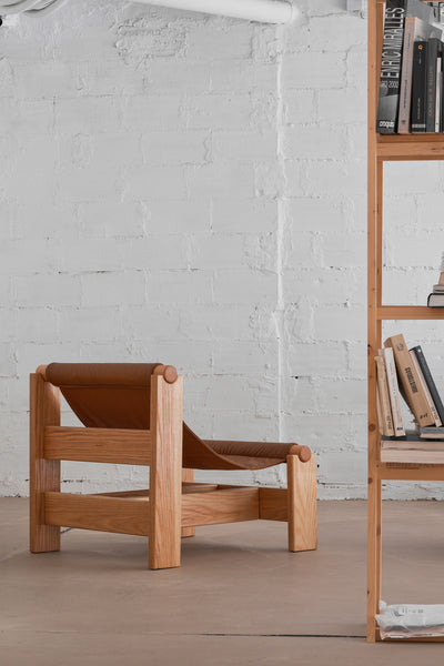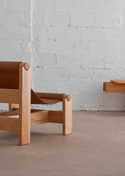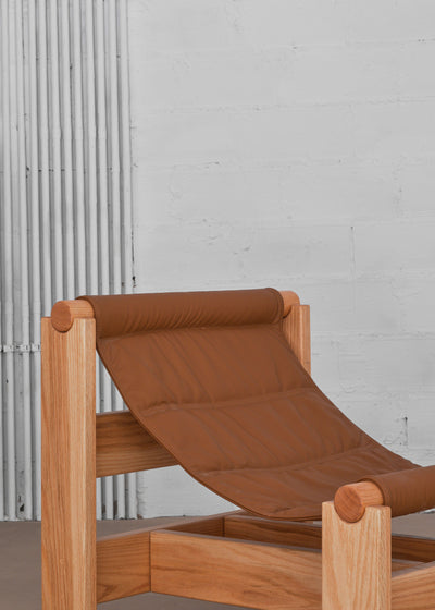 Oak wood, natural lacquered and leather.