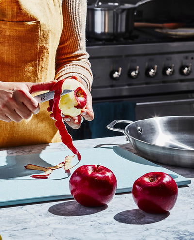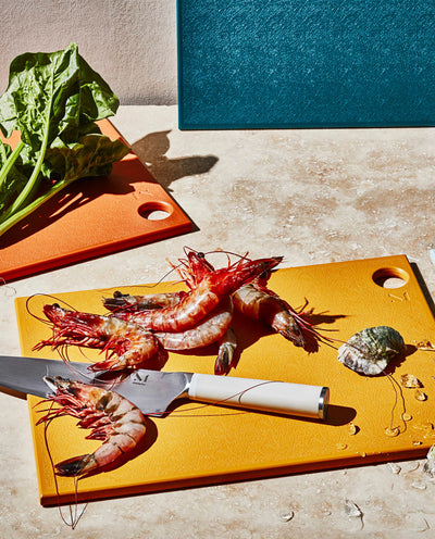 Master meal prep with color-coded cutting boards. These BPA-free boards are made entirely of kitchen plastic scraps and renewable sugarcane. One small step for sustainability, one giant leap for kitchen goods.