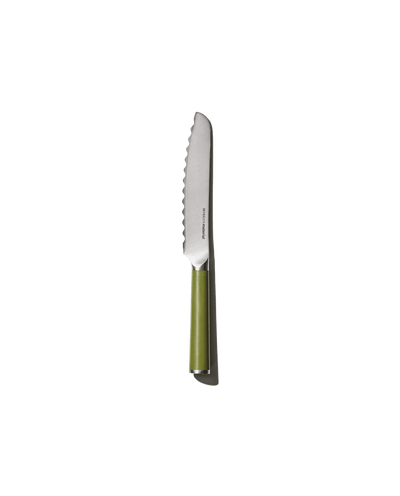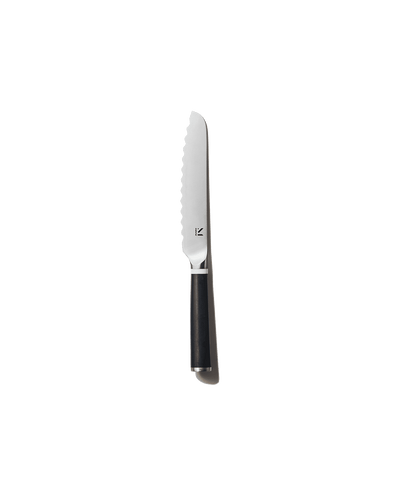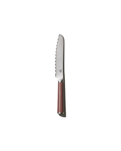 As seen in The Strategist, Esquire, House Beautiful and more. Much more than a bread knife, our 6” serrated utility knife is appropriately sized for smoother slicing of tomatoes, peaches, chocolate and more. Plus, this knife features a pointed, Santoku-inspired tip and wavy-toothed blade for a cleaner, crisper cut than your average knife.