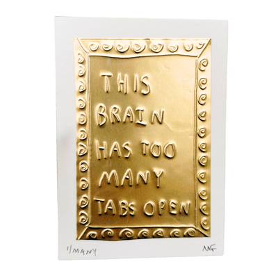 A hand embossed artwork featuring the text 'This Brian Has Too Many Tabs Open' on gold coloured tin, mounted on a white cardstock.