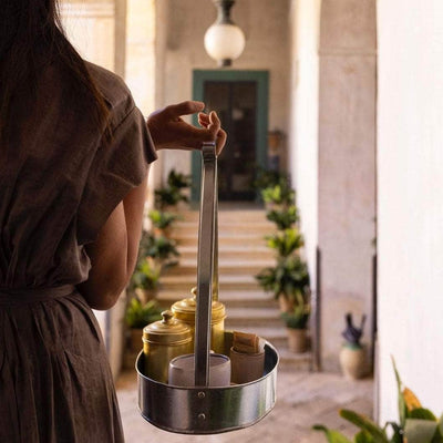 This hand-wrought galvanised steel sheet tray with high handle is exclusive to Maison Flâneur. Made to naturally swing without allowing the items inside the tray to move. Designed by CICILEU for Palazzo Daniele.
