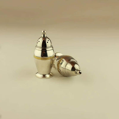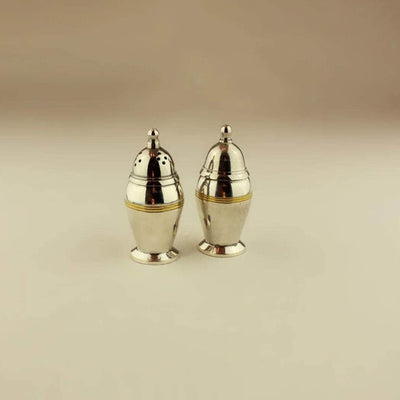 Pair of Art Deco style table salt and pepper shakers in silver with decorative gold band. Internal compartment with removable plastic piece.
