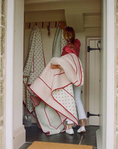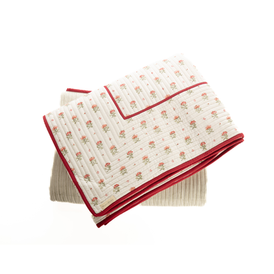 Hand block printed in India, these reversible quilts have the Blume print on one side and a faded green stripe on the other. Double bound in our signature deep red piping, they are as smart as they are cosy. The Single Size fits generously over a Single Bed, or very neatly on a Double. Please note, each quilt is entirely unique as there will be natural irregularities in the print due to the hand block printing process.