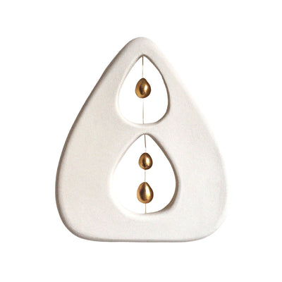 The piece is made from textured stoneware and the body is unglazed so you can admire the light cream colour of the clay. The golden drops are glazed with a satin glaze and painted with 24 karat gold lustre with some visible brush strokes. There is a softness and imperfection attributed to the handmade nature of the piece with visible textural markings from the clay and making process. The reverse of the piece features two 8mm holes to fit screws for hanging the piece on a wall. The piece weighs 990g.