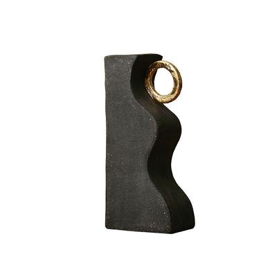 A flowing sculpture that features a soft curved side, straight edge and gold lustre circular detail. Handmade with black textured stoneware clay with gold lustre detail. It has a raw exterior and transparent glazed interior.