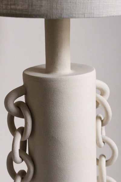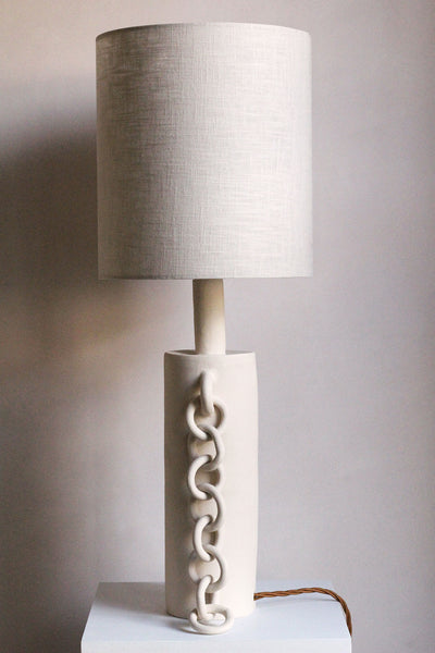 Formed from white stoneware, this lamp features chain linked motifs to represent unity and connection. These hopeful sentiments are integral today in a world that feels ever more divided and disconnected. The striking yet simple chains hang from the lamp base, adorning the form like jewellery, the links connecting to one another and the main body of the piece. The lamp features a bayonet brass fitting with an antique brass twisted cord and a tall cream/grey linen shade handmade in the UK. Lamps can be fitted with a UK, EU or US socket.