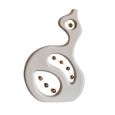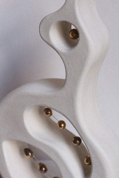Handmade from stoneware, this abstract curvaceous sculpture features shapely hollows of negative space within its body. 24 karat gold lustre fragments in the shape of of droplets and spheres float within the spaces, suspended from gold lacquered copper wire. The piece is about seeing beyond the surface and taking a deeper look inside to understand what’s really going on.