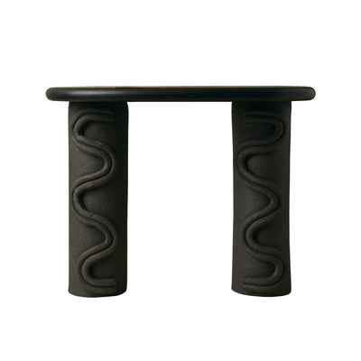 This mixed media side table beautifully pairs oak and ceramic. The stained oak table top is made from locally sourced, repurposed felled urban trees that would have been burned. The top features unique with characterful knots, grains and a smooth finish. The two legs are made from black textured stoneware clay with oscillating wave details that represent the waves of emotion when falling in lust.