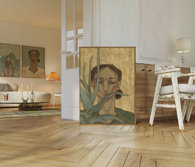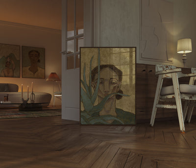 Aloe Vera is about finding comfort and recognition in the natural world. The plant and the figure overlap, almost blending, showing how being close to nature can feel like being close to yourself. Aloe is a plant known for care, soothing, and healing — and here it becomes a symbol of gentle self-repair and belonging without effort.