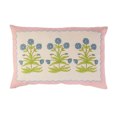 Block printed on to a silk/cotton mix and over stitched with French knots and running stitch. Backed in a plain coloured cotton with zip.