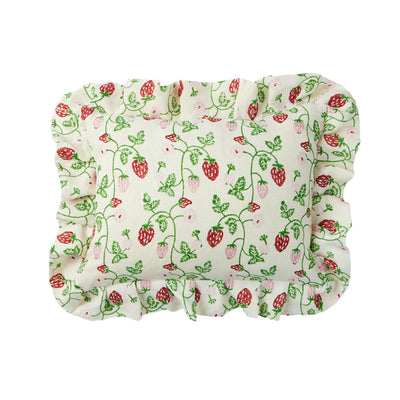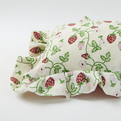 The dreamiest of cushions with a rambling pattern of wild strawberries denoting tradition, nostalgia and British charm. With a matching relaxed frill, backed with our new hand dyed plain pink linen.
