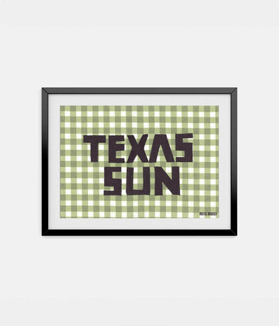 'Texas Sun' is a high-quality A3 print of an original fabric collage artwork by Motel Bodega. Inspired by simple pleasures; warm light, slow days, and the nostalgia of a gingham kitchen tablecloth. Hand-cut letters on soft green checks give it a homespun, feel-good charm that’s easy to live with.