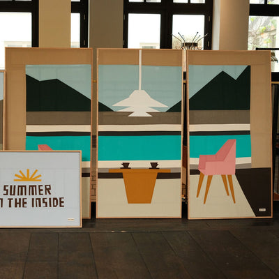 The quiet luxury of a coffee with the view of poolwater dancing in the sun. This series of 3 artworks is as bold as it is calm; stitched together from beautiful remnants of fabric, each piece was designed, cut and sewn in my Amsterdam studio, then framed by hand with meranti wood using only what's needed. Motel Bodega prioritizes sustainability and celebrates authenticity.