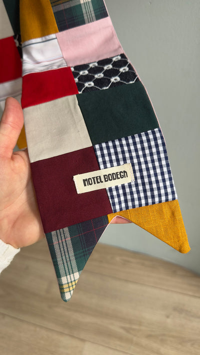 Handmade by Motel Bodega from beautiful scraps of fabric, including linens, pure wools, checks and lovely embroidered denim. All post-production waste fabrics from the fashion industry, gathered slowly over time.