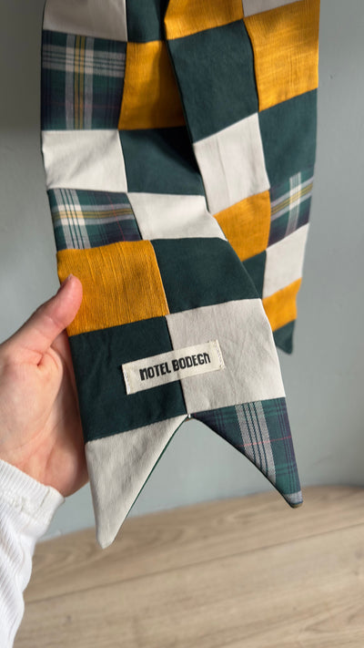 Handmade by Motel Bodega from beautiful scraps of fabric, including linens, pure wools, checks and lovely embroidered denim. All post-production waste fabrics from the fashion industry, gathered slowly over time.