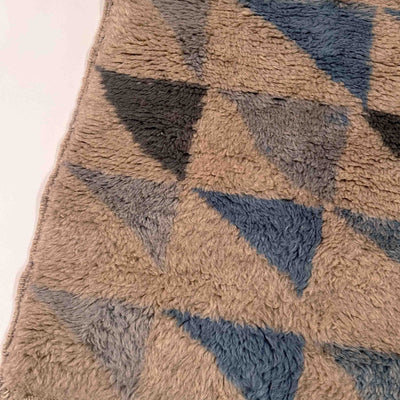 This M'rirt rug features geometric shapes in gradients of blue, reminiscent of a "Mouja", a wave in Tamazight. Handmade in M'rirt in the highlands of the middle Atlas in Morocco, known for their bold patterns and soft wool. The perfect injection of playfulness in any small space.