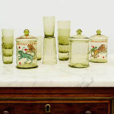 Inspired by the Middle Ages and Renaissance-era features, the glass bonbonnières are decorated with raspberry-shaped rosettes and the characteristic Forest Green colour of traditional Krautstrunk and Berkemeyer glass.