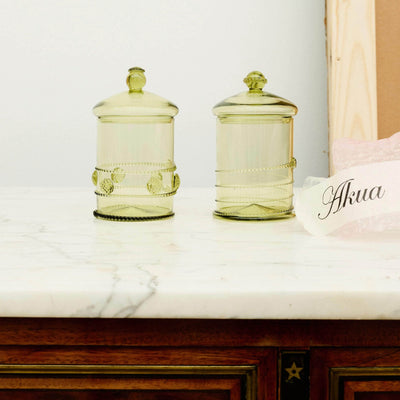 A vessel of elegance, perfect for keeping precious belongings.  Inspired by the Middle Ages and Renaissance-era features, the glass bonbonnières are decorated with raspberry-shaped rosettes and the characteristic Forest Green colour of traditional Krautstrunk and Berkemeyer glass. Part of the Karl Collection, named after Annika’s husband, each bonbonnière is handmade in accordance with Czech traditions, but in the spirit of Akua and with its own delicate swirl.