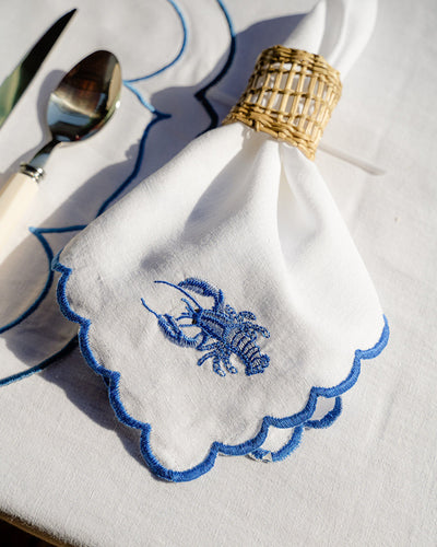 White Linen and Cotton Napkin with Blue Picot Trim and Lobster Embroidery