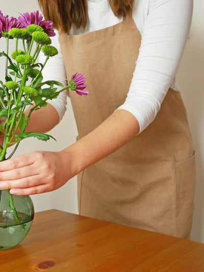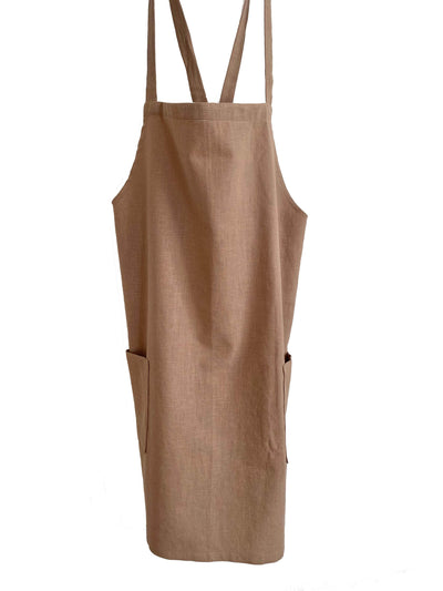Pinafore style apron. Beautifully soft and easy to care for, the linen apron is a stylish and functional must have item to protect your clothes while cooking, crafting, gardening and more. The cross back strap design means less fuss and a looser fit, and the aprons have two large side pockets. Made from 100% washed linen. Measures approximately 84cm wide x 78cm long (each apron is made bespoke by hand so may vary slightly). All linen products can be machine washed at 30 degrees.