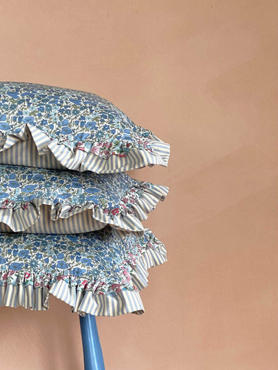 These are seriously fancy cushions ! Handmade from Liberty fabric ‘Poppy and Daisy Blue’ and featuring a double ruffle in ‘Annabella Blue’ and blue stripe cotton.