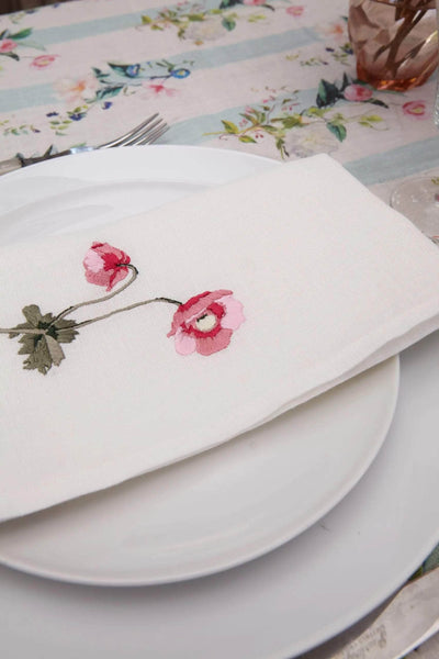 Introducing the Flora Stripe embroidery. An anemone flower designed to mix and match with our Flora Stripe print. These napkins are the perfect addition to any table, inside or out.